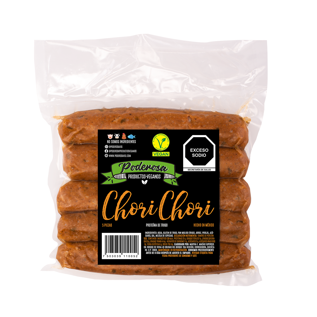 Proteína de trigo, arroz y especias hacen de este chori un platillo con gran consistencia y sabor, perfecto para tus parrilladas, guisos, etc.