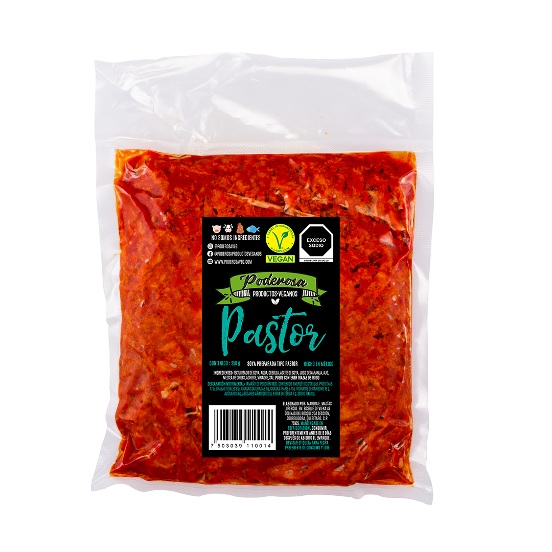 Proteína de soya condimentada con axiote, vinagre, naranja y chiles que dan el clásico sabor mexicano a pastor! Pruébalo!